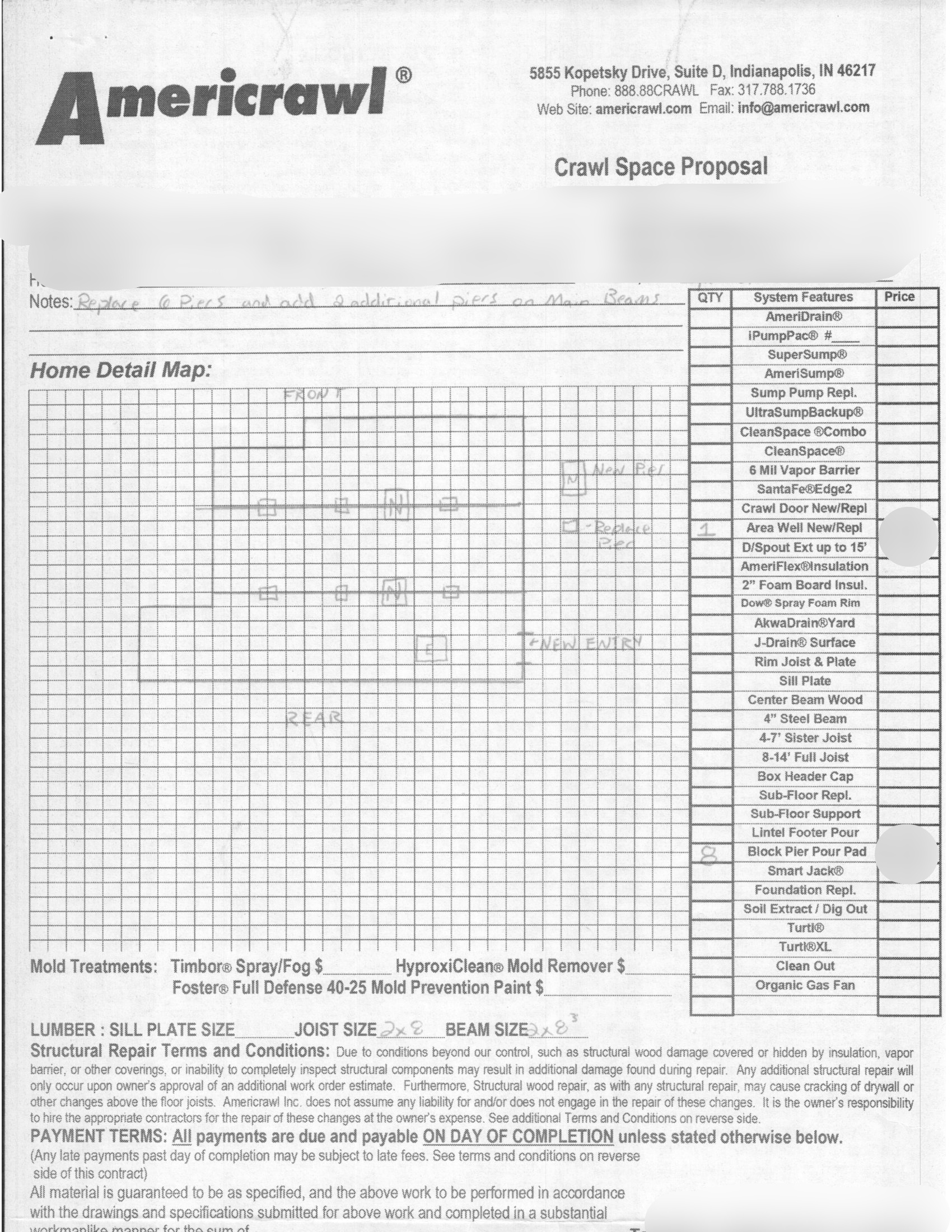 The scope of work includes the installation of one steel crawlspace access door to provide secure and long-lasting entry to the crawlspace. In addition, eight poured concrete pads are installed beneath the center beam of the home to create stable and properly engineered bearing points. An 18-foot section of the center beam is then replaced and set on the new concrete pads, restoring proper structural support to the floor system. This work corrects existing deficiencies, improves load distribution, and enhances the overall structural stability and integrity of the home.