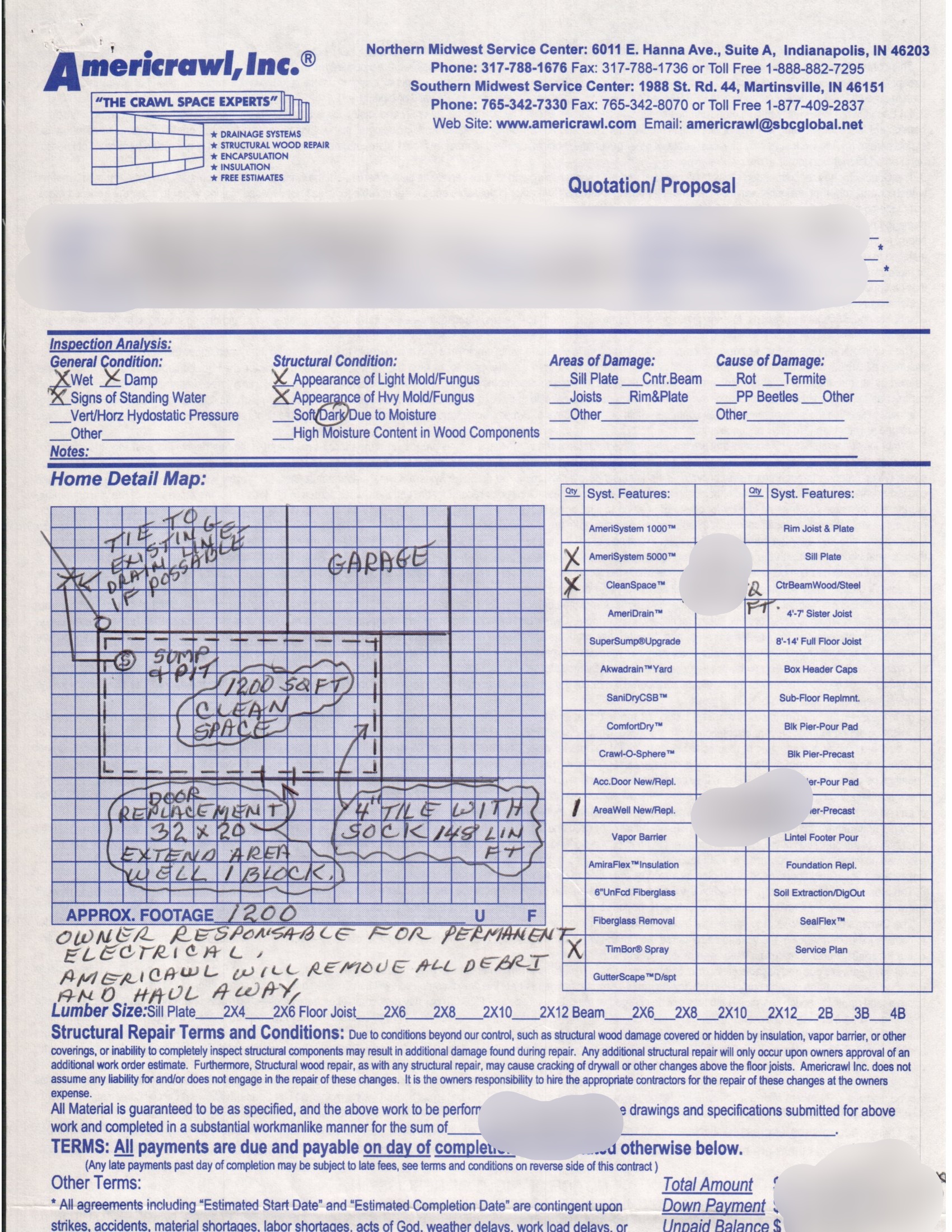 Americrawl repaired 35 feet of sill plate, installed 27 sister joists and 38 box header caps, replaced their sump pump and laid new vapor barrier.
