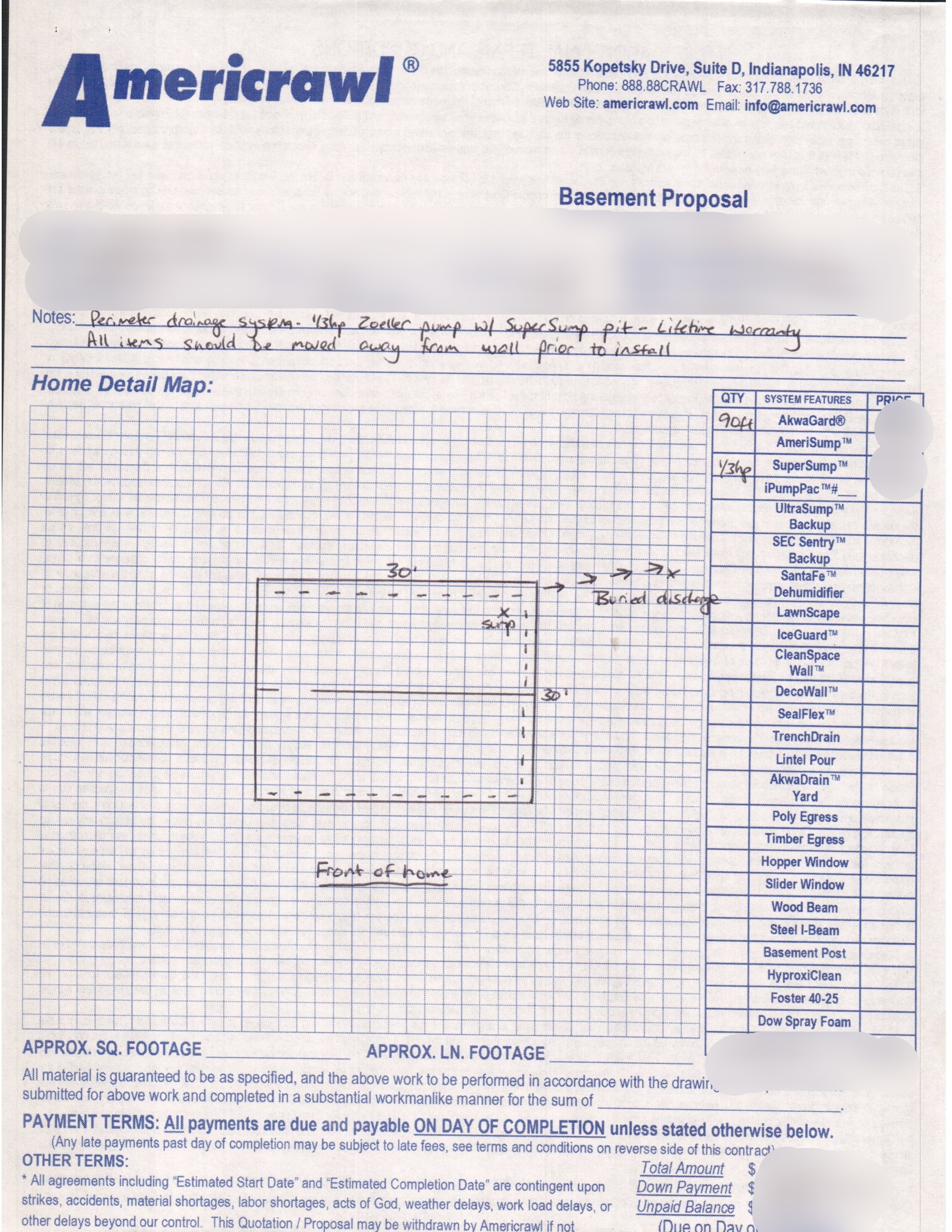 Americrawl installed: 1050 sq ft of Vapor Barrier 1 Crawl Space Access Door 6" Steel I-Beam Sprayed 1050 sq ft of fungicide