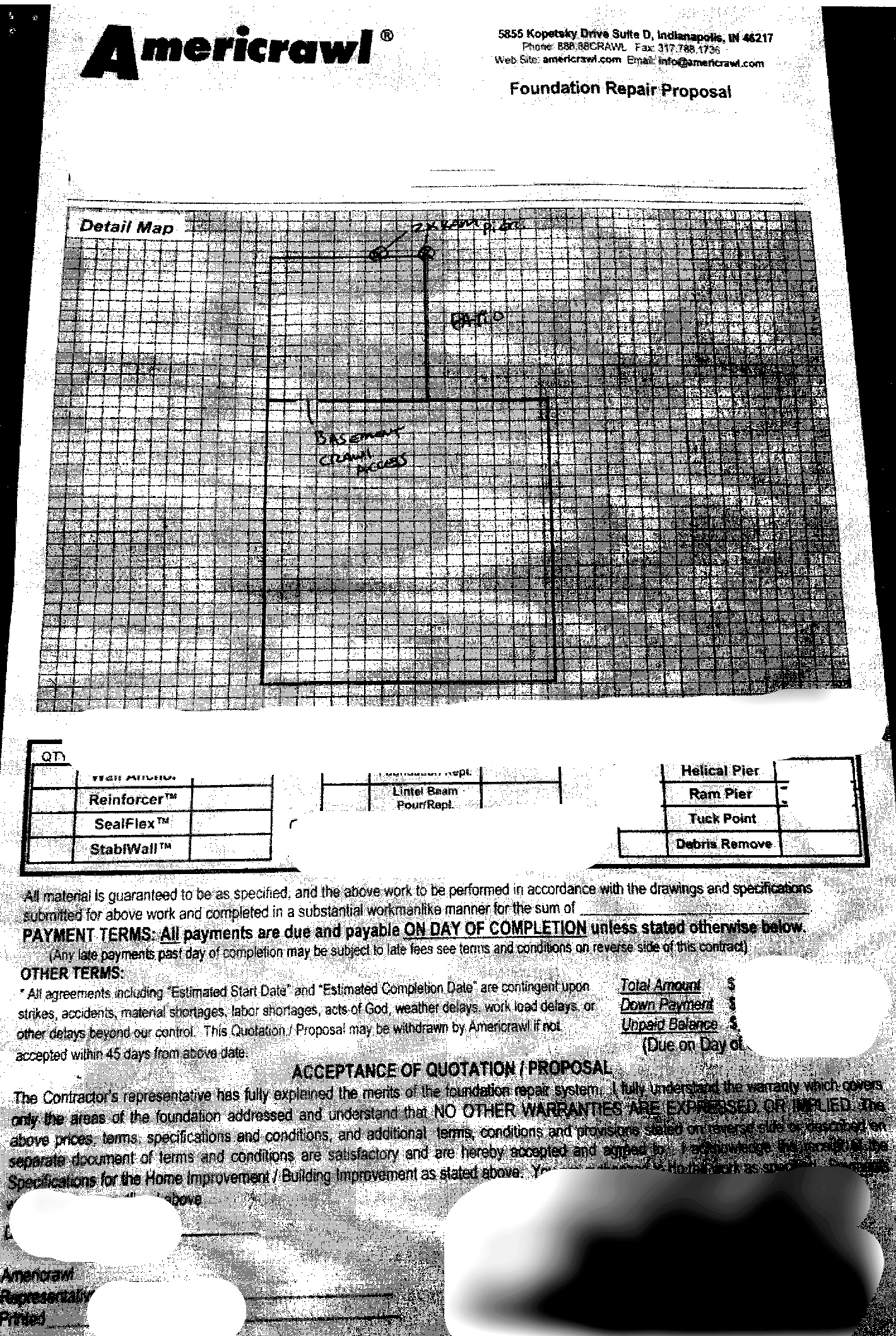 Americrawl was contracted the following: 1) Replace sump pump 2) Install a dehumidifier 3) Replace sill plate 4) Install sister joists 5) Fog an antifungal